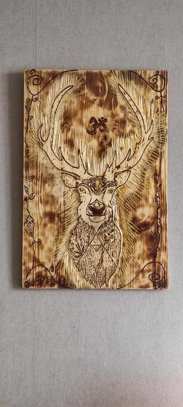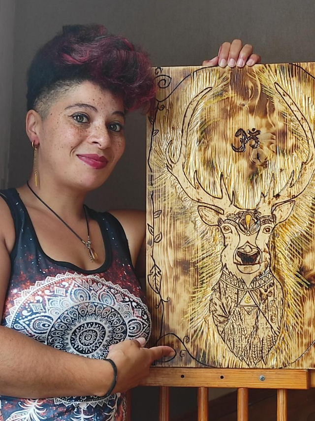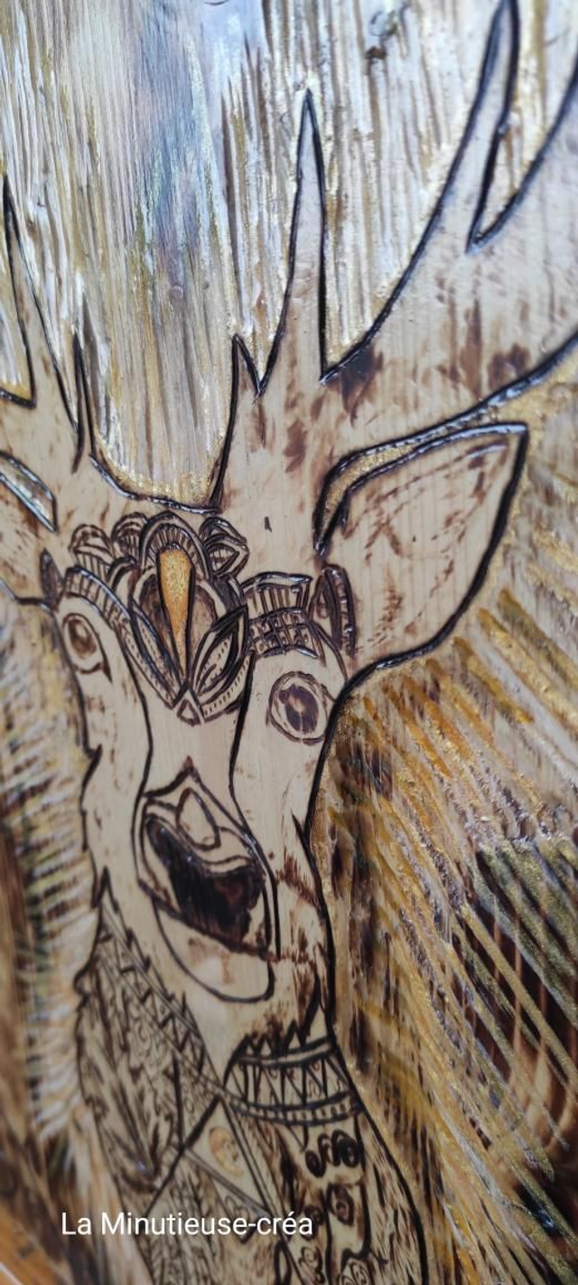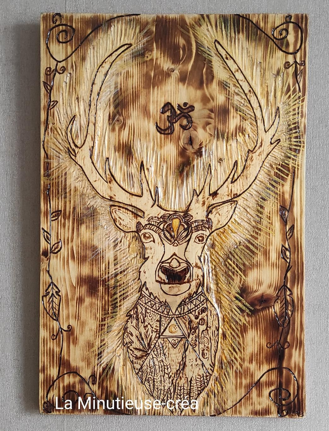 La toile est réalisée à la main (dessin pyrogravure chalumeau). La gravure et sculpture au couteau de bois pour qu'il puisse exprimer son rayonnement.