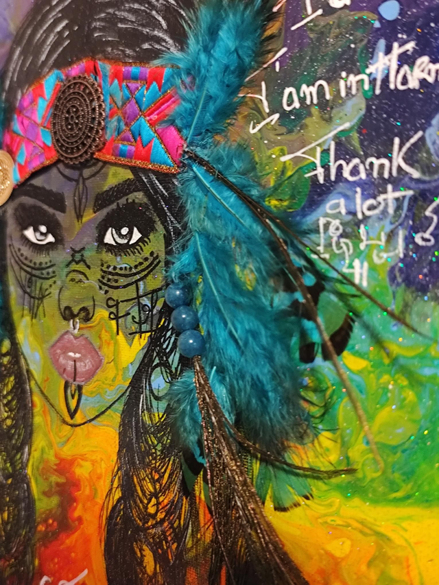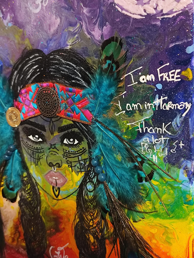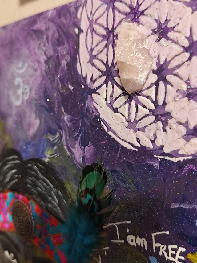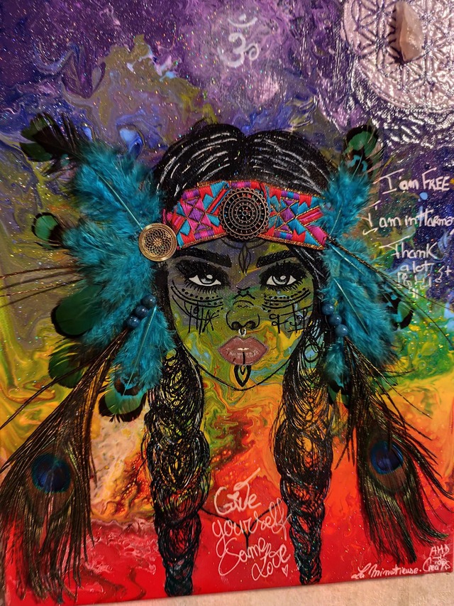 La toile en fond a été travaillée à l'acrylique sur la représentation de l'alignement de ses 7 chackras 🙏.