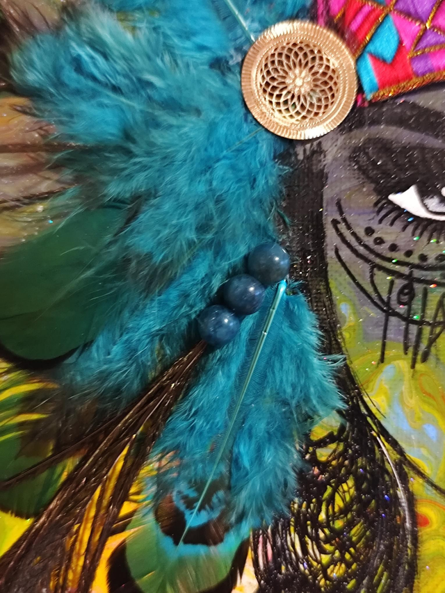 Les plumes bleues teintées sont celles de faisans et bien sûr les Boucles d'oreilles avec les pierres sont celles de paons.