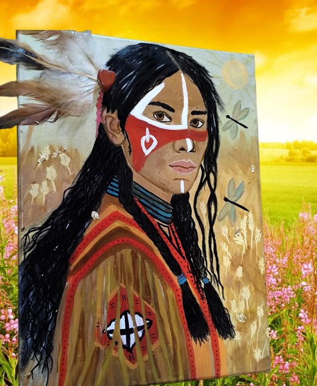 Cette toile sur coton et peinture acrylique et orné de plume de coqs et de fesant et d'une pierre de Jaspe Rouge représentatif de son nouvelle encrage en partie.
